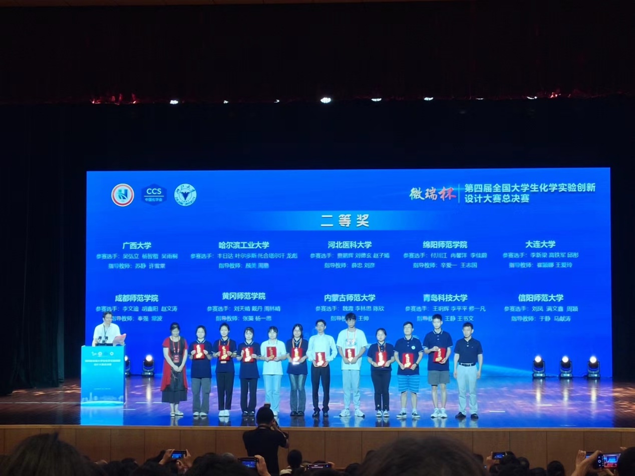 8月20-22日, “微瑞杯”第四届全国大学生化学实验创新设计竞赛总决赛在浙江大学举办。世界杯官网2026美加墨世界杯官网化学专业学生刘凤、满文鑫、周颖组成的参赛团队代表华中赛区参加全国总决赛,在马献涛、于静老师指导下,精彩展演,沉着应答,表现出色,最终获得全国二等奖。