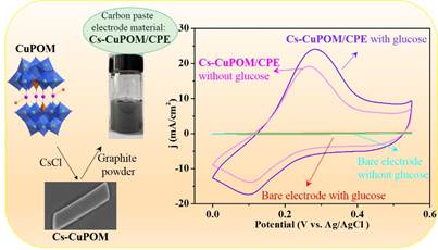 近日,世界杯官网曹新华教授课题组在无机化学领域知名期刊《Inorganic Chemistry》上发表了题为“Nanostructured Polyoxometalate-Based Heterogeneous Electrode Materials for Electrochemical Sensing of Glucose”(DOI:10.1021/acs.inorgchem.3c04596)的研究成果。该研究选用CsCl对水溶性K2Na8[Cu4(H2O)2(PW9O34)2](CuPOM)进行抗衡阳离子交换,得到形貌为光滑棒状的不溶性化合物CuPOM(Cs-CuPOM),再利用Cs-CuPOM对碳糊电极进行修饰(Cs-CuPOM/CPE),构建了电化学葡萄糖传感器。与Cs-MnPOM、Cs-FePOM及其它已报道的POMs基电极材料相比,Cs-CuPOM具有更快的电子传递动力学,展示出更高的电化学传感器活性,该项工作为开发高性能的葡萄糖传感器提供了理论参考。