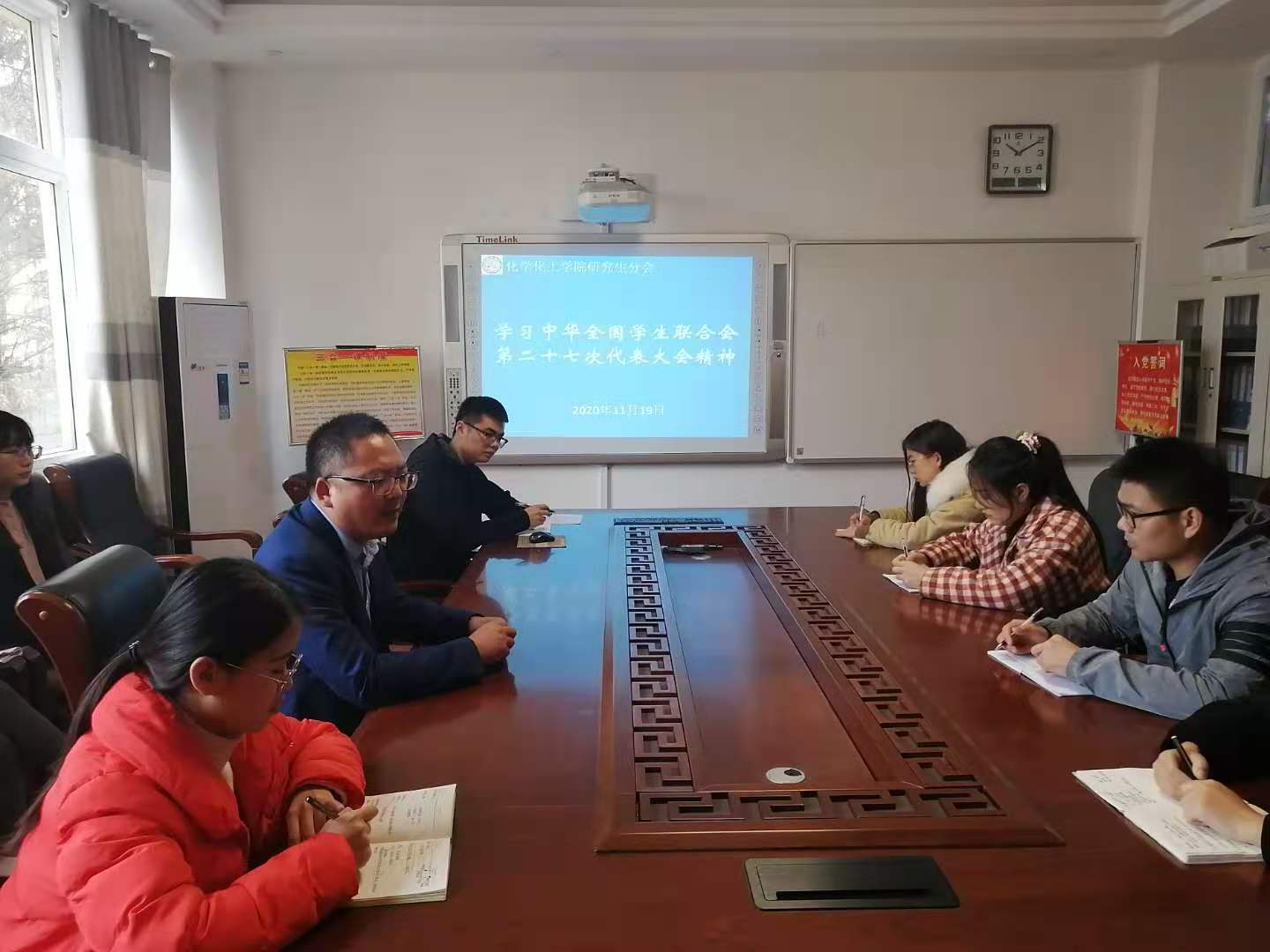 为深入贯彻落实习近平总书记关于青年工作的重要思想、进一步深化高校学生会及研究生会改革、支持和引导学生会更好地服务青年学生成长成才,1119日,2026美加墨世界杯官网研究生在实验楼313会议室召开了学习中华学生联合会第二十七次代表大会精神为主题的会议,研究生党支部书记、班主任曹俊涛老师出席会议,本院研究生分会主席团成员及各部门工作人员参加会议。