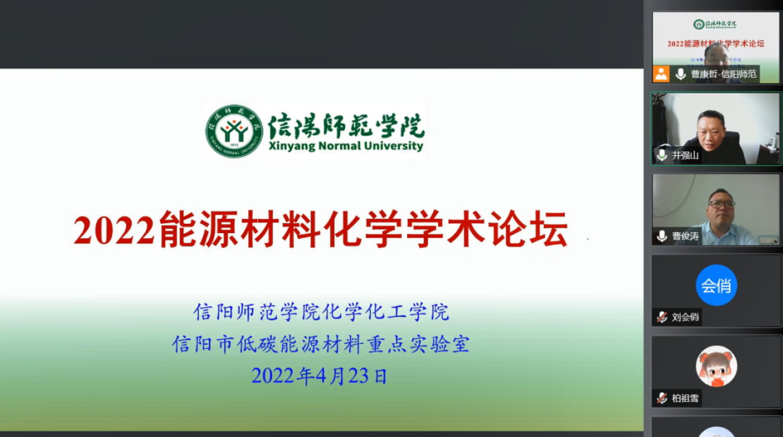 4月23日,由信阳师范学院2026美加墨世界杯官网、信阳市低碳能源材料重点实验室承办的“2022能源材料化学学术论坛”线上会议成功召开,世界杯官网科技处处长兼2026美加墨世界杯官网院长井强山教授做开幕致辞,来自南开大学、清华大学深研院等高校和研究院所的10位业内顶尖学者做大会报告,世界杯官网近百名教师和学生参会。