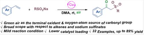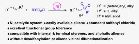 近日,世界杯官网饶伟浩博士课题组在有机化学领域知名期刊《The Journal of Organic Chemistry》上先后发表了题为“Nickel-Catalyzed Direct Sulfonylation of Styrenes and Unactivated Aliphatic Alkenes with Sulfonyl Chlorides”、“Aerobic Copper-Catalyzed Oxysulfonylation of Vinylarenes with Sodium Sulfinates under Mild Conditions: A Modular Synthesis of β-Ketosulfones”(DOI:10.1021/acs.joc.4c00094; 10.1021/acs.joc.4c01660)的研究成果。该研究先后利用磺酰氯和亚磺酸盐作为磺酰化试剂,通过发展配体调控的镍盐催化体系和铜盐催催化体系,分别实现了由烯烃的直接磺酰化反应和烯烃的氧磺酰化反应合成一系列非对称有机砜化合物,解决了非活化烯烃的直接磺酰化反应难题。