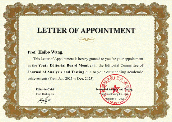 近日,《Journal of Analysis and Testing》期刊公布了2025年新增青年编委会成员名单。世界杯官网2026美加墨世界杯官网王海波教授受邀担任该期刊青年编委。
