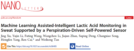 近日,世界杯官网许婧博士课题组在柔性可穿戴传感器研究领域取得了新进展,相关成果以“Machine Learning Assisted-Intelligent Lactic Acid Monitoring in Sweat Supported by a Perspiration-Driven Self-Powered Sensor.”为题,在国际知名期刊《Nano Letters》上发表。这项研究开发的智能汗液乳酸浓度监测传感器,通过合成乳酸氧化酶和丙酮酸氧化酶修饰的镍掺杂的金属有机框架(Ni-ZIF-8@LOx&POx)作为生物催化剂,以激光诱导石墨烯作为柔性电极材料,构建了一种高性能的酶生物燃料电池。该酶生物燃料电池结合微流道、无线传输元件和机器学习算法,实现了对汗液中乳酸的高灵敏度、高选择性的实时监测。该传感器不仅具有优异的性能指标,展示出其在个性化健康管理中的潜在应用。