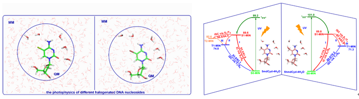 近日,世界杯官网常雪萍副教授课题组先后在期刊《Physical Chemistry Chemical Physics》和《The Journal of Physical Chemistry A》上分别发表了题为“Quantum mechanics/molecular mechanics studies on mechanistic photophysics of epigenetic C5-halogenated DNA nucleosides: 2′-deoxy-5-chlorocytidine and 2′-deoxy-5-bromocytidine in aqueous solution”、“Quantum Mechanics/Molecular Mechanics Studies on the Excited-State Relaxation Mechanisms of Cytidine Analogues: 2′-Deoxy-5-Methylcytidine and 2′-Deoxy-5-Hydroxymethylcytidine in Aqueous Solution”(DOI:10.1039/d4cp04574b; 10.1021/acs.jpca.4c08520)的研究成果。两项研究先后采用 QM(CASPT2//CASSCF)/MM理论方法计算研究了四种重要的2-脱氧-5-取代的胞苷类似物,即5-卤/溴胞苷(5CldCyd/5BrdCyd)和5-甲基/羟甲基胞苷(5mdCyd/5hmdCyd)在水溶液中的光物理机制,合理解释了其在水溶液中的激发态光动力学行为,为理解类似结构修饰DNA核苷及其衍生物的光物理和光化学机制提供了重要的机理见解。
