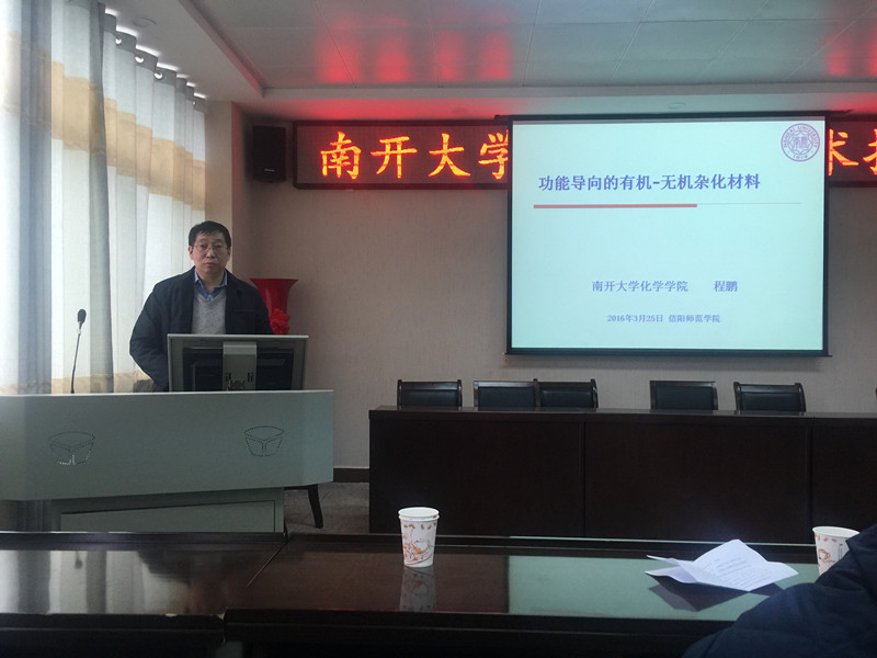 3月25日下午,南开大学化学学院程鹏教授应邀在2026美加墨世界杯官网学术报告厅作了题为“功能导向的有机-无机杂化材料”的学术报告。信阳师范学院副院长刘彦明出席并主持了报告会。参加报告会的还有化院院长杨性坤教授、副院长井强山教授以及学院的青年教师和全体研究生。
