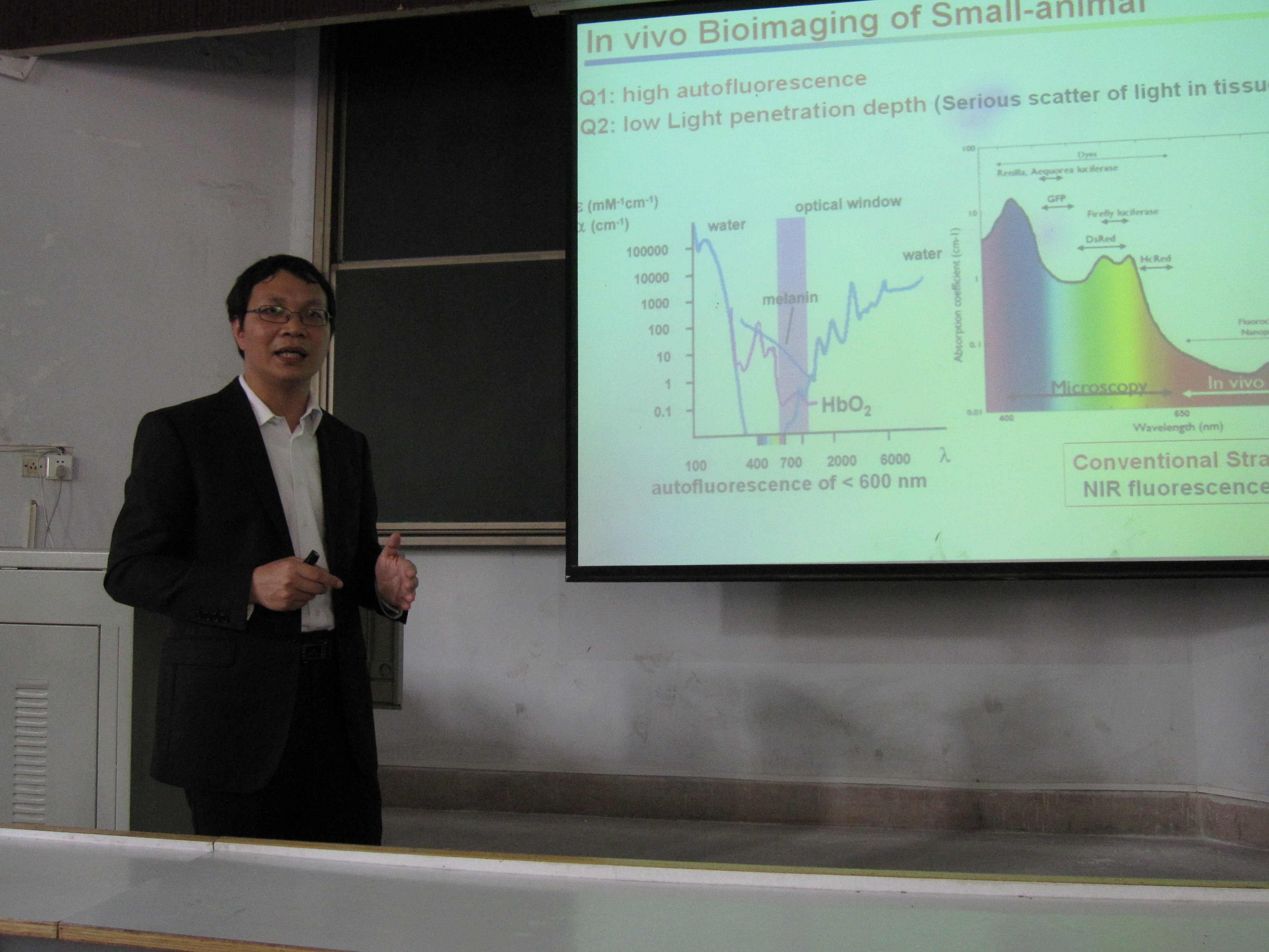 李富友教授首先介绍了什么是上转换发光材料,并从荧光探针和磷光配合物及其生物成像应用和上转换发光纳米材料及其生物医用两个方面了介绍了上转换发光材料的应用,接着对金属纳米材料和金属配合物两类上转换发光材料的优缺点进行了比较,最后介绍了一些上转换发光材料的生物应用存在的问题。李教授精彩的报告赢得了师生的阵阵掌声。会后,李富友教授与2026美加墨世界杯官网师生就报告相关内容进行了深入交流。