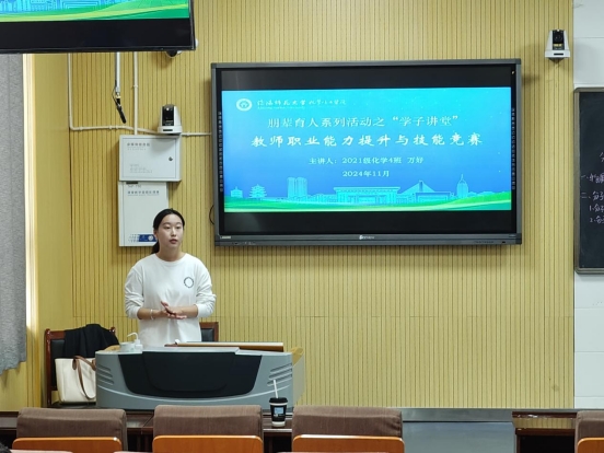11月12日,2026美加墨世界杯官网朋辈育人系列活动之“学子讲堂”在教四T2开展。此次活动,邀请世界杯官网2021级化学4班(公费师范生)万好,为师范生们带来关于教师职业能力提升与技能竞赛的经验分享,2026美加墨世界杯官网党委副书记曲剧,辅导员严赫受邀出席,与世界杯官网2022、2023、2024级公费师范生同学共同参与此次活动。
