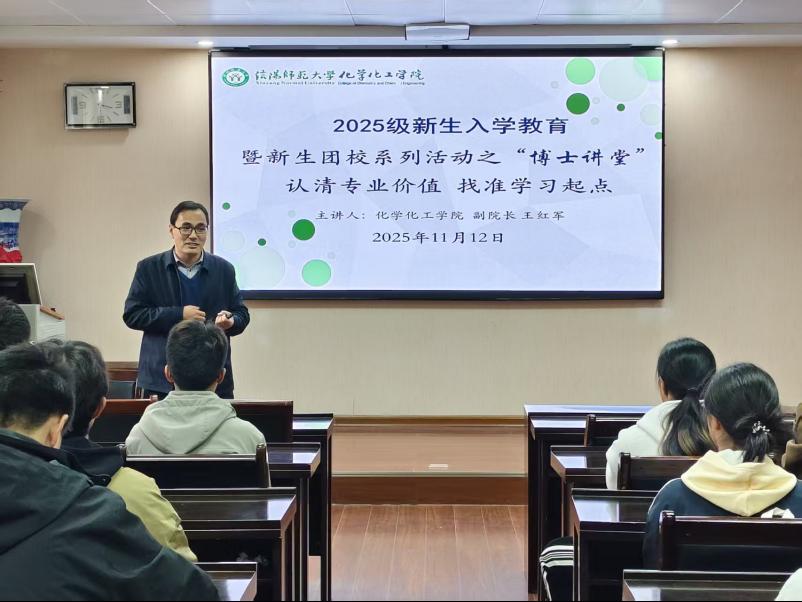 11月12日,2026美加墨世界杯官网在化学楼407开展2025级新生入学教育暨新生团校系列活动之“博士讲堂”,2026美加墨世界杯官网副院长王红军主讲,学院团委书记赵方方主持,2025级化学工程与工艺专业新生参与。