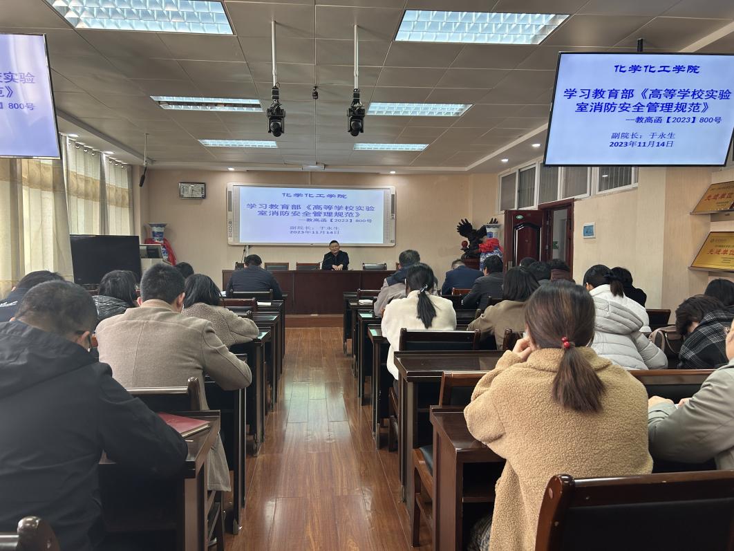 为进一步规范实验室安全管理,2023年11月14日下午,世界杯官网在化学实验楼407会议室召开《高等学校实验室消防安全管理规范》集中学习宣讲会。会议由学院党委书记郭鹏主持,学院领导班子成员及全体教师参加了此次会议。