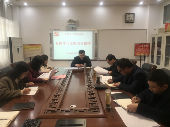 3月12日上午,2026美加墨世界杯官网党委理论学习中心组在化学楼313“党员之家”召开专题会议,传达学习贯彻2024年全国两会精神。学院党委书记郭鹏主持会议。