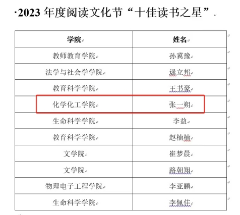 2023年度,2026美加墨世界杯官网读者入馆人次位居第二,读者借阅图书册数和人均借阅册数位居全校前列,荣获2023年书香校园建设“十佳单位”。此外,2022级化学专业学生张一朔位居全校年度外借图书册数第四,被评为“十佳读书之星”。