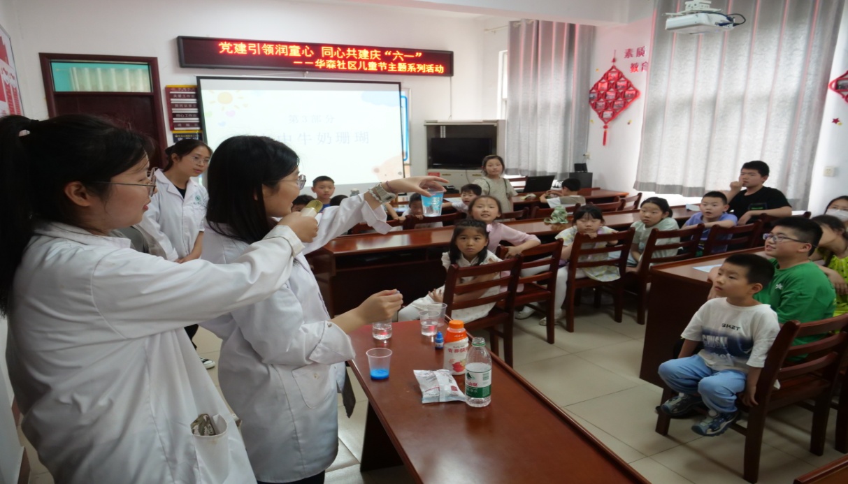 2026美加墨世界杯官网的党员志愿者为小朋友们带来了一场别开生面的趣味实验。志愿者们在对化学实验做基本讲解后,分别展示了《水中圆环》《水中牛奶珊瑚》《彩虹塔》《彩虹喷泉》四个化学实验,让社区小朋友感受到了化学的魅力,激发了他们对科学的热爱和探索精神。志愿者充分运用所学化学知识服务居民,使化学知识深入居民,走进社区,形成了“党组织组织支持、大学生积极、社区群众欢迎”的良好实践氛围,化院学子在实践中受教育、长才干、做贡献。