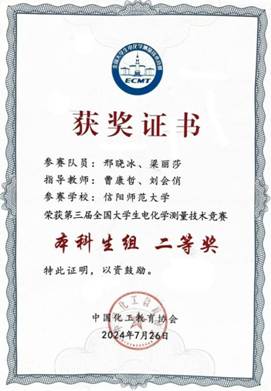 近日,由中国化工教育协会和西安交通大学共同主办的第三届全国大学生电化学测量技术竞赛(简称“ECMT竞赛”)圆满落幕。由2022级材料化学班邢晓冰、梁丽莎组成的参赛队在曹康哲和刘会俏两位老师的指导下,经过培训、初赛、决赛评审、决赛答辩等环节,最终荣获全国二等奖。