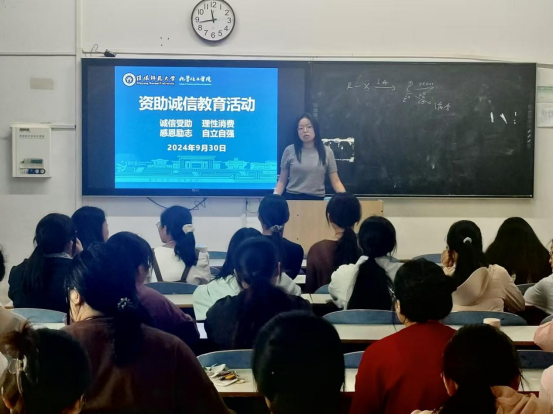会上,翟成辉老师希望同学们在社会和国家资助政策的温暖关怀下,能够积极进取、奋发图强,努力成长成才,理解和体会资助体系的深远意义。同时也强调,资助过程必须严格遵循诚信原则,希望同学们能够提高诚信意识,在勤奋学习、不断进取的过程中,坚守诚信、懂得感恩,始终践行自己的初心。最后提醒各位同学,最近诈骗案件频发,务必提高警惕,加强自我保护意识,了解常见的诈骗手段及防范措施,谨防诈骗行为的发生。活动过程中,部分学生分享了自己受助后在学习上和生活上的励志成长变化,表示非常感恩国家资助政策给予的关怀与帮助,同时引发了现场学生们感恩资助的情感共鸣。