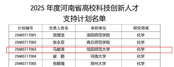 近日,河南省教育厅公布了2025年度河南省高校科技创新团队和创新人才立项名单(教科技〔2024〕354号文件),世界杯官网马献涛副教授入选2025年度河南省高校创新人才支持计划名单,获批科研资助经费30万元。