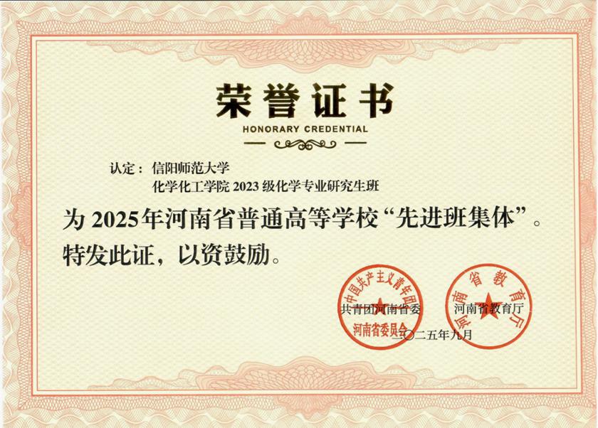 近日,共青团河南省委、河南省教育厅公布了2025年“河南省普通高等学校‘先进班集体’”的认定结果,世界杯官网2023级化学专业研究生班凭借出色的综合表现,从众多参评单位中脱颖而出,荣获这一省级荣誉称号。