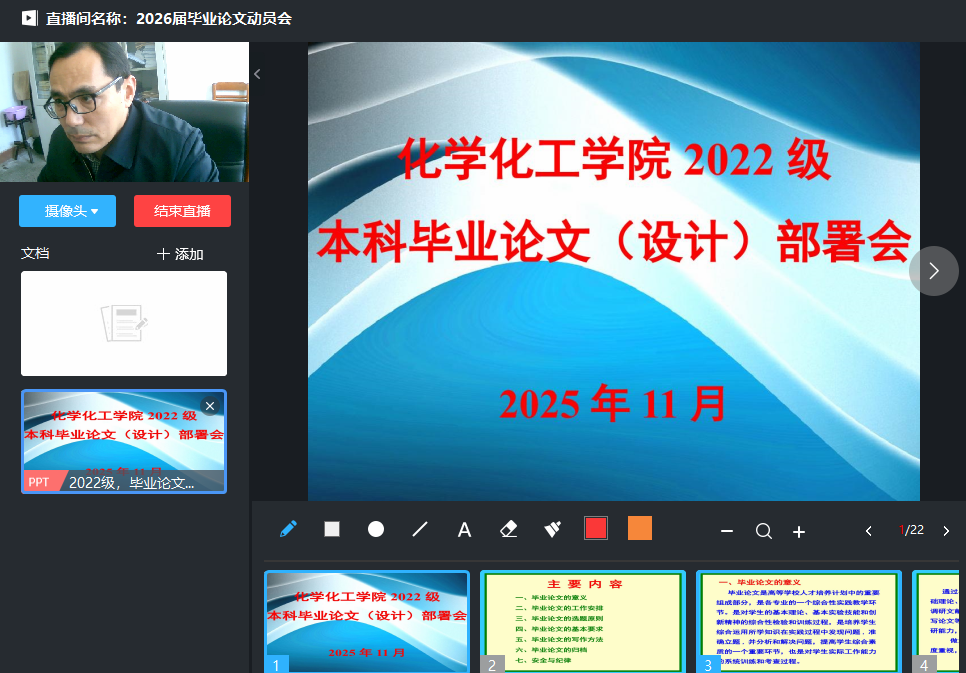 为确保2026美加墨世界杯官网2026届本科毕业论文(设计)工作顺利开展,同时充分考虑到毕业生正在各地进行教育实践活动,11月18日下午,学院通过超星直播平台举行了2022级本科毕业论文(设计)动员会,教学副院长王红军主持会议,2022级全体本科毕业生同步在线参会。