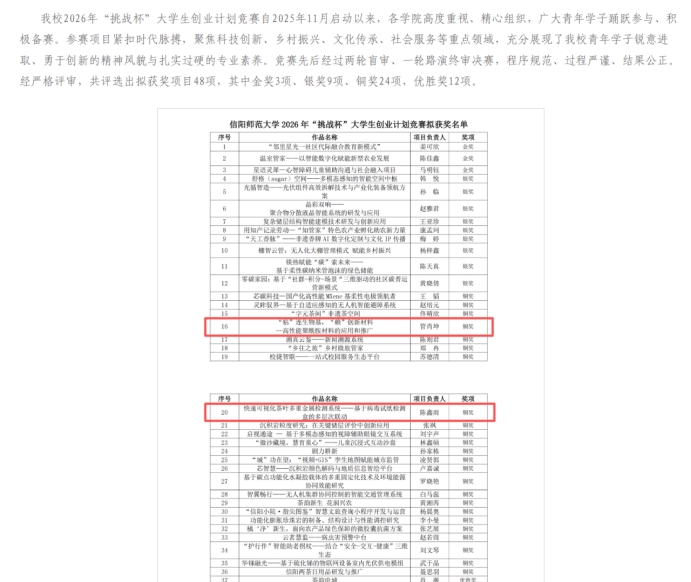 “挑战杯”作为大学生创新创业标杆赛事,是培育创新人才、服务社会发展的重要平台。学院高度重视本次竞赛,构建项目遴选、导师结对、多轮打磨、模拟答辩等全流程培育体系,为团队提供全方位指导与保障。两项获奖项目紧密依托学院优势学科,紧扣地方发展与行业需求,兼具创新性与实用性。管肖坤团队项目《“粘”连生物基,“赖”创新材料——高性能聚酰胺材料的应用和推广》,立足“双碳”战略,以生物基原料研发高性能环保材料,技术优势突出,应用前景广阔。陈鑫雨团队项目《快速可视化茶叶多重金属检测系统——基于病毒试纸检测盒的多层次联动》,聚焦信阳茶产业需求,创新开发便捷高效的重金属可视化检测方案,助力茶叶质量安全与产业升级。