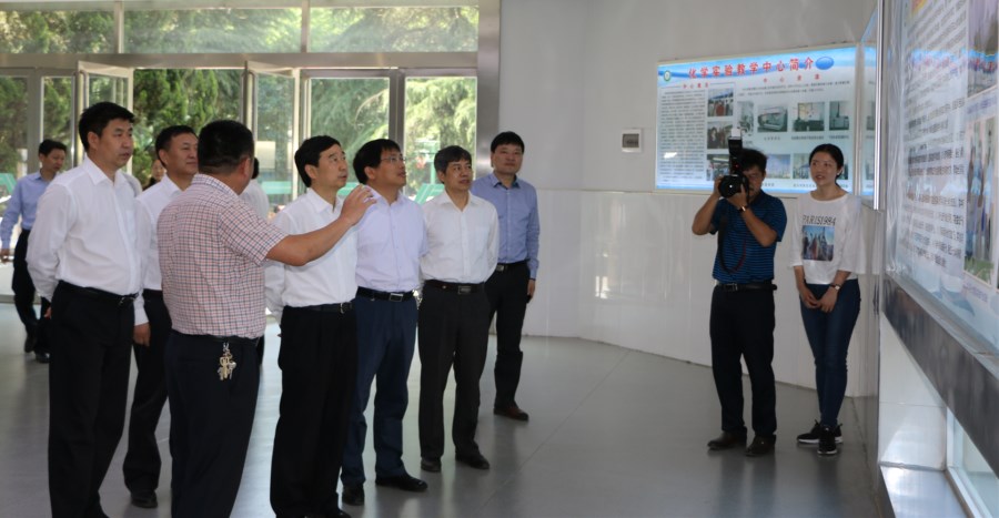 5月17日上午,信阳市委书记乔新江、市委秘书长王新会、市直有关部(局、委)负责人等一行30余人,在信阳师范学院党委书记宋争辉、校长李俊陪同下,莅临信阳师范学院2026美加墨世界杯官网考察指导。各级领导一行分别到2026美加墨世界杯官网豫南非金属矿物资源高效利用重点实验室、信阳市非金属材料展馆等实验设备场所考察指导工作,副校长齐城、陈登报等领导同志一起随同考察,2026美加墨世界杯官网党委书记郭鹏、院长井强山、非金属材料研究所副所长刘鹏等领导陪同考察。
