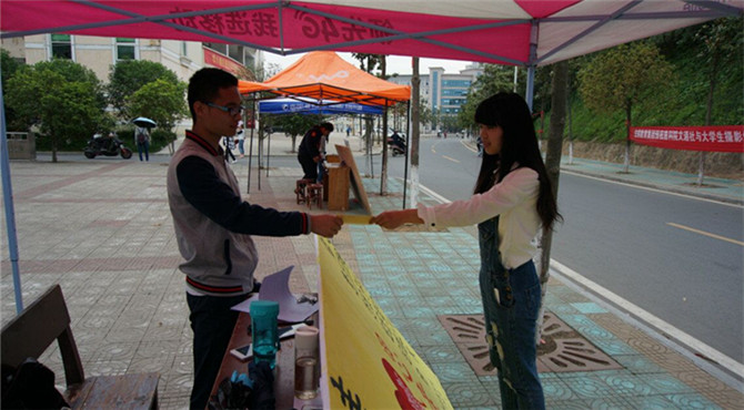 活动当天,爱心服务社员就早早的搭起帐篷,准备好发放的爱的信封。前来领信封的同学络绎不绝,社员们也耐心的为同学们讲解这次活动的意义。一封小小的家书,承载的是对母亲深深的思念与感恩;传递的是离家在外的游子对家中母亲不朽的挂念与关怀。随后,社员们通过积极发送“妈妈,我爱你”的传单,让更多的同学来参与其中,感受爱的温暖。据悉,本次传情活动,将在本月28至29日两天收取爱的信封,寄回家中。