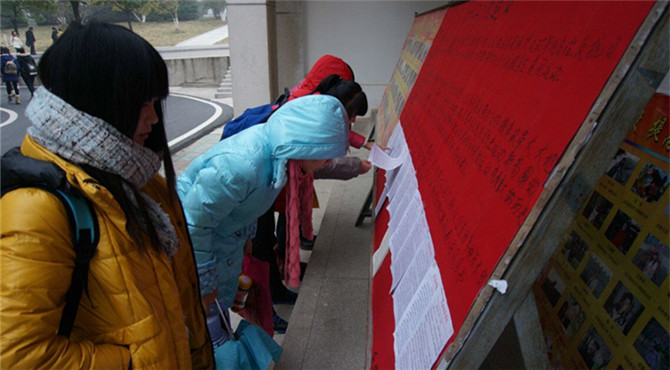 经过层层的篩选,最终于12月9日评选出若干篇优秀文章在化学实验楼前供同学们鉴赏。一篇篇激昂的文章,书写着那风雨飘摇,山河破碎的峥嵘岁月,还有那不灭的爱国情怀和不朽的民族精神。无数大学生义无反顾投身于火热的革命,他们的心激烈的碰撞着,发出一二·九运动的呐喊,刮起抗日救国的旋风。同学们在文章中说到,一二·九运动是经霜饱雨而永不垂头的花朵,记载国人的无畏,渗透民族的血泪和辛酸。一二·九运动不仅仅是爱国运动更是英勇筑成的坚实力量,撑起民族未来的抗日运动。此时的文字已化为点点感人心弦的画面,吸引无数同学驻足观看。