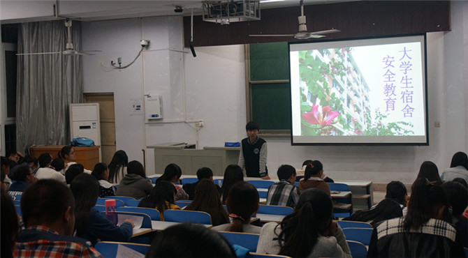 为提高同学们的安全防范意识,让大家更好地适应校园生活。10月11日晚七点,2026美加墨世界杯官网于教四梯一举行大学生宿舍安全教育活动。本次活动由化院学生会主席董浩洋主持,团总支老师路振国与2014级、2015级全体宿舍长、班委及劳卫部全体成员共同参加了此次活动。