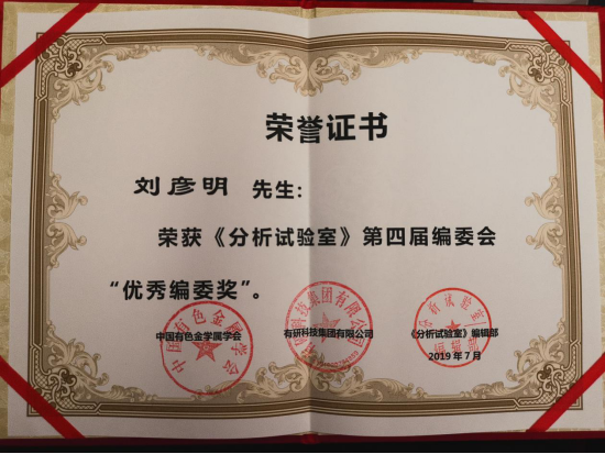 2019年7月30日,《分析试验室》期刊第五届编委会会议在北京召开。世界杯官网刘彦明教授荣获《分析试验室》第四届编委会“优秀编委奖”,并被续聘为该刊第五届编委。期刊名誉主编、中国工程院屠海令院士为四位获奖编委进行了颁奖。