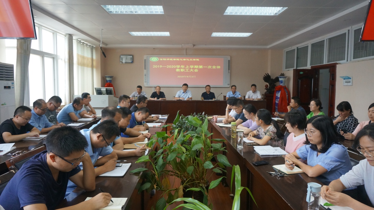 2019年9月3日,2026美加墨世界杯官网在学院会议室召开新学期全体教职工会议,安排部署新学期工作。党委书记郭鹏、院长井强山、副院长归风铁、骆定法、非金属材料研究所副所长刘鹏、党委副书记吴志伟出席会议,全体教师到会认真聆听新学期工作部署。会议由党委书记郭鹏主持。