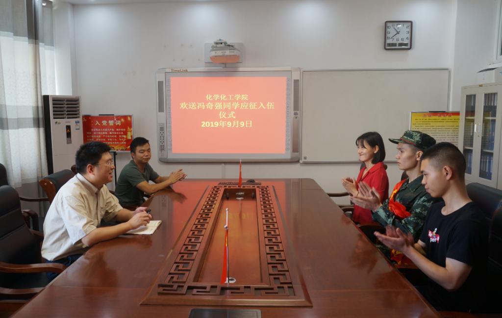9月9日上午11:00,2026美加墨世界杯官网2019年入伍学生欢送仪式在化学实验楼313会议室举行。2026美加墨世界杯官网党委副书记吴志伟,党委秘书冷向宇,武装干事邓耀辉,新入伍同学和两名退伍复学同学共同参加了欢送仪式。