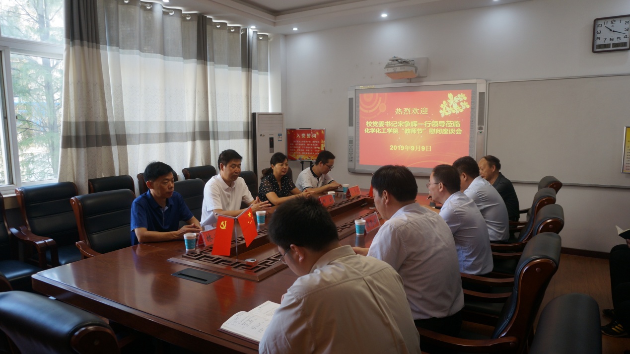 9月9日,在第35个教师节来临之际,校党委书记宋争辉一行领导莅临2026美加墨世界杯官网,亲切慰问2026美加墨世界杯官网教师代表黄克靖教授(学校首批南湖学者、武汉大学博士、南京大学博士后、教授、高被引青年学者),向化院教师致以节日的问候。党办主任林兴岚、教务处处长郑云、人事处余伟陪同慰问并出席座谈会。2026美加墨世界杯官网党委书记郭鹏、院长井强山、副院长归风铁、党委副书记吴志伟,2026美加墨世界杯官网教师曹俊涛博士、王海波博士参加了座谈会。