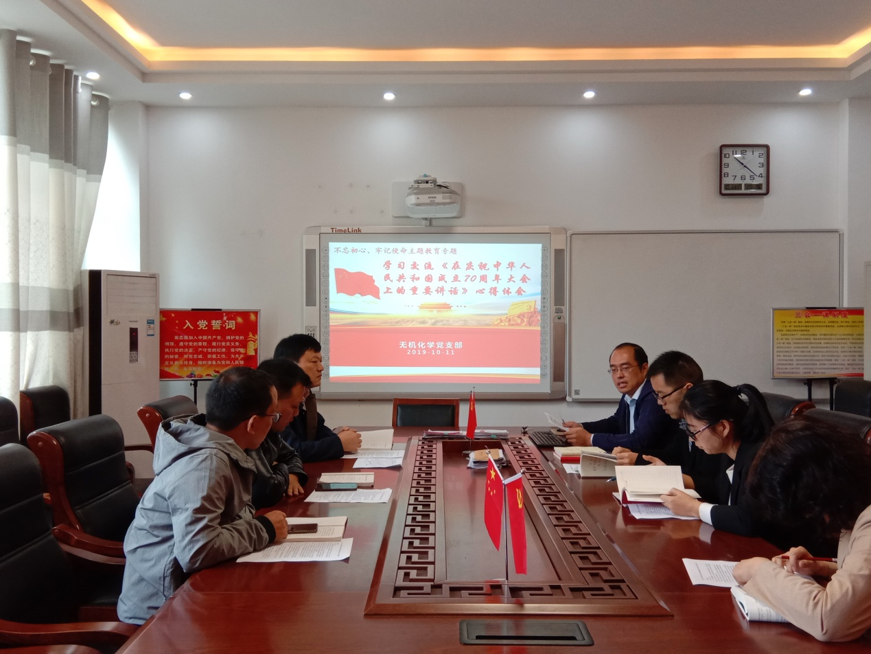 10月11日,2026美加墨世界杯官网无机化学支部在“党员之家”召开“不忘初心、牢记使命”主题教育学习交流活动。支部全体成员参加了此次会议。会议由党支部书记邹国栋主持。学院党委书记郭鹏参加该支部的学习交流,并作主题教育活动指导。