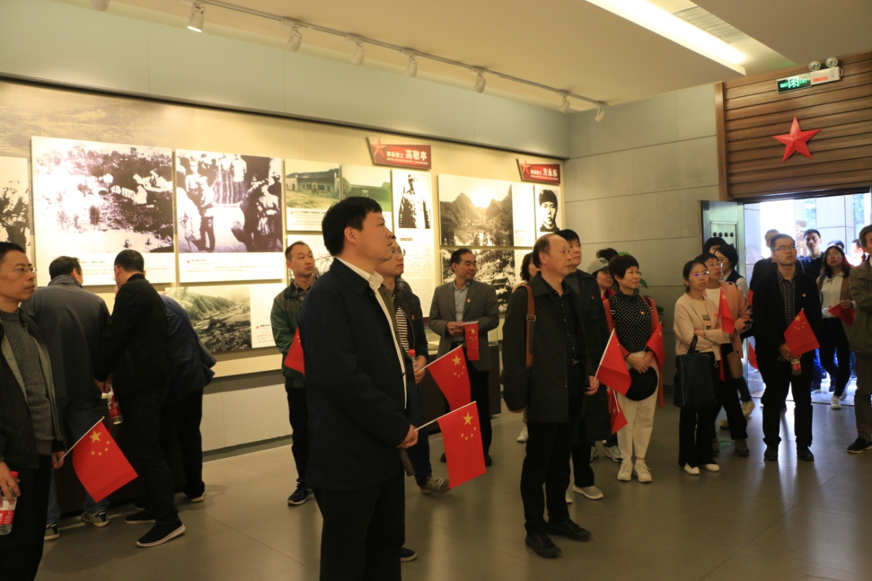 党员同志们首先来到新县鄂豫皖苏区首府烈士陵园,瞻仰革命烈士纪念碑、纪念堂,向革命烈士纪念碑敬献花篮并三鞠躬,深情缅怀为革命胜利献出宝贵生命的革命先烈。在党委书记郭鹏带领下,全体党员重温入党誓词,追忆峥嵘岁月,接受红色洗礼,铭记入党初心,心中郑重默念“革命烈士永垂不朽”。随后大家怀着无比崇敬的心情走进了烈士纪念堂,在讲解员生动讲述下,重温历史故事,共同追忆了鄂豫皖苏区的革命历史,真切感受革命先烈为了共产主义远大理想、为了党的事业奋斗不息的伟大胸襟和无私情怀。主题教育实践考察团党员同志们认真听取介绍,凝神追思。郭鹏在考察第一站小结时强调,要深入学习贯彻总书记在新县考察调研时的重要讲话精神,充分利用好老区的“红色基因库”,讲好党的故事、革命的故事、根据地的故事、英雄和烈士的故事,把老区的红色基因传承好、弘扬好。