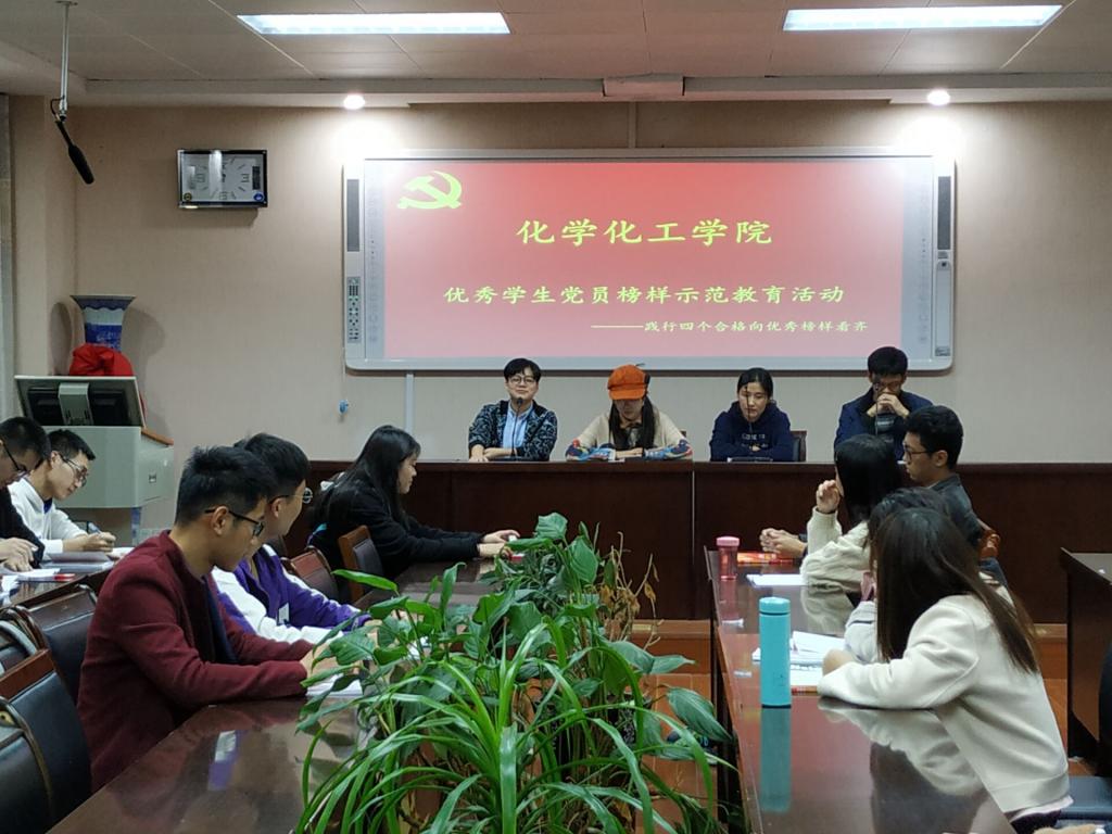 10月17日晚,2026美加墨世界杯官网在化学楼407开展“优秀学生党员榜样示范教育”活动。化学化工学员四名优秀学生党员代表王润萌、李铁炎、任芳、杨娇娇及世界杯官网第32期党员发展对象培训班学员一同参加此次活动。