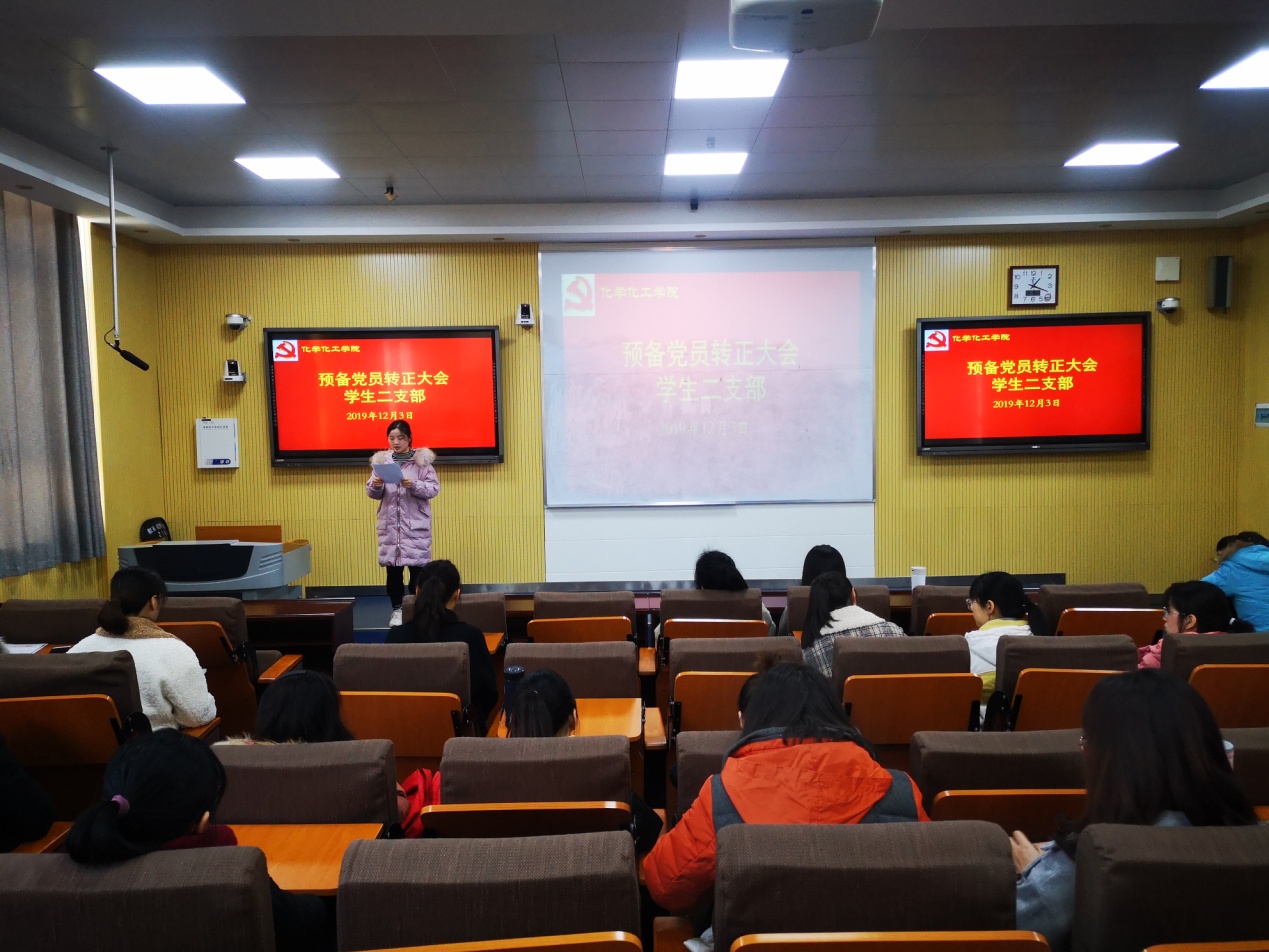 本次支部会议由孟瑞芳同志主持。首先,由申请转正的预备党员汇报自己在预备期间的表现,表明自己对转正的态度和今后的决心,并宣读转正申请书;随后,学生党支部宣读了党员发展对象的党内外群众意见。与会有表决权的党员也都发表了对预备党员转正的意见,肯定了优点,指出了缺点,提出了希望。在执行预备党员接收程序时,严格履行了党章规定的预备党员转正手续,本次大会共有魏君、王文文、王涵、高琰美、李梦瑶五名预备党员转为正式党员。