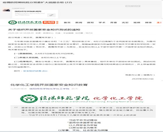 首先,学院通过分党委(扩大)视频会议,认真组织了线上专题学习传达、专题研讨交流、专题知识测试、专题视频收看。分党委书记郭鹏认真传达有关通知文件精神,专题部署主题日教育活动。随后,党委班子成员井强山、归风铁、骆定法、刘鹏、吴志伟等积极带动322结对子分组,各党支部书记及时组织本支部、小组全体党员、教师积极参加国家安全知识专题学习,各班级、团支部认真组织学生全员参加了专题知识学习、专题视频收看。师生通过学习强国、网络、微信等渠道认真研读交流《国家安全法》,积极参加国家安全知识测试。此外,学院通过微信公众平台专门及时策划制作一期“国家安全知识学习”微信推送,进行专题学习宣传,扩大了学习宣传效果。