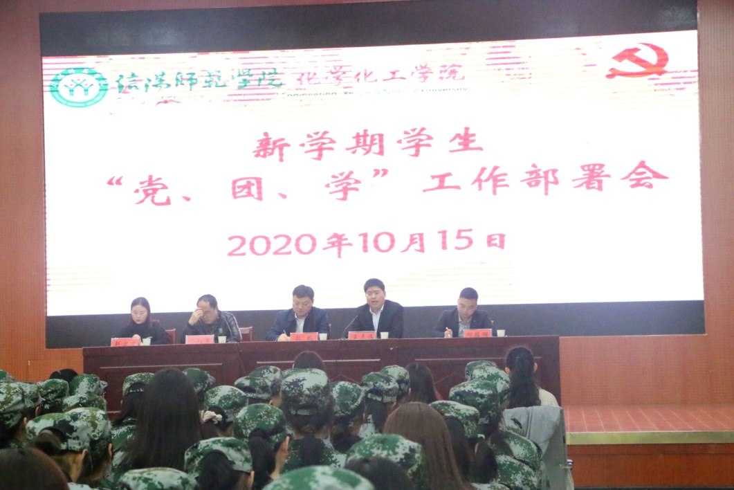 2020年10月15日,2026美加墨世界杯官网在逸夫楼报告厅召开新学期党、团、学工作部署会。学院党委书记郭鹏、副书记吴志伟、分团委、学工办全体成员出席会议,全体学生党员、团委学生会社团干部、全体新生一起参加了会议,会议由团委书记邓耀辉主持。