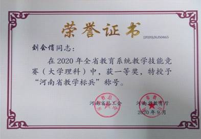 近期,2026美加墨世界杯官网教师在河南省教育厅、河南省总工会组织的2020年度教学技能竞赛中再获佳绩,通过层层选拔,被学校选送的世界杯官网青年教师刘会俏不负众望,斩获一等奖,同时被授予 “河南省教学标兵”称号并获发奖章。