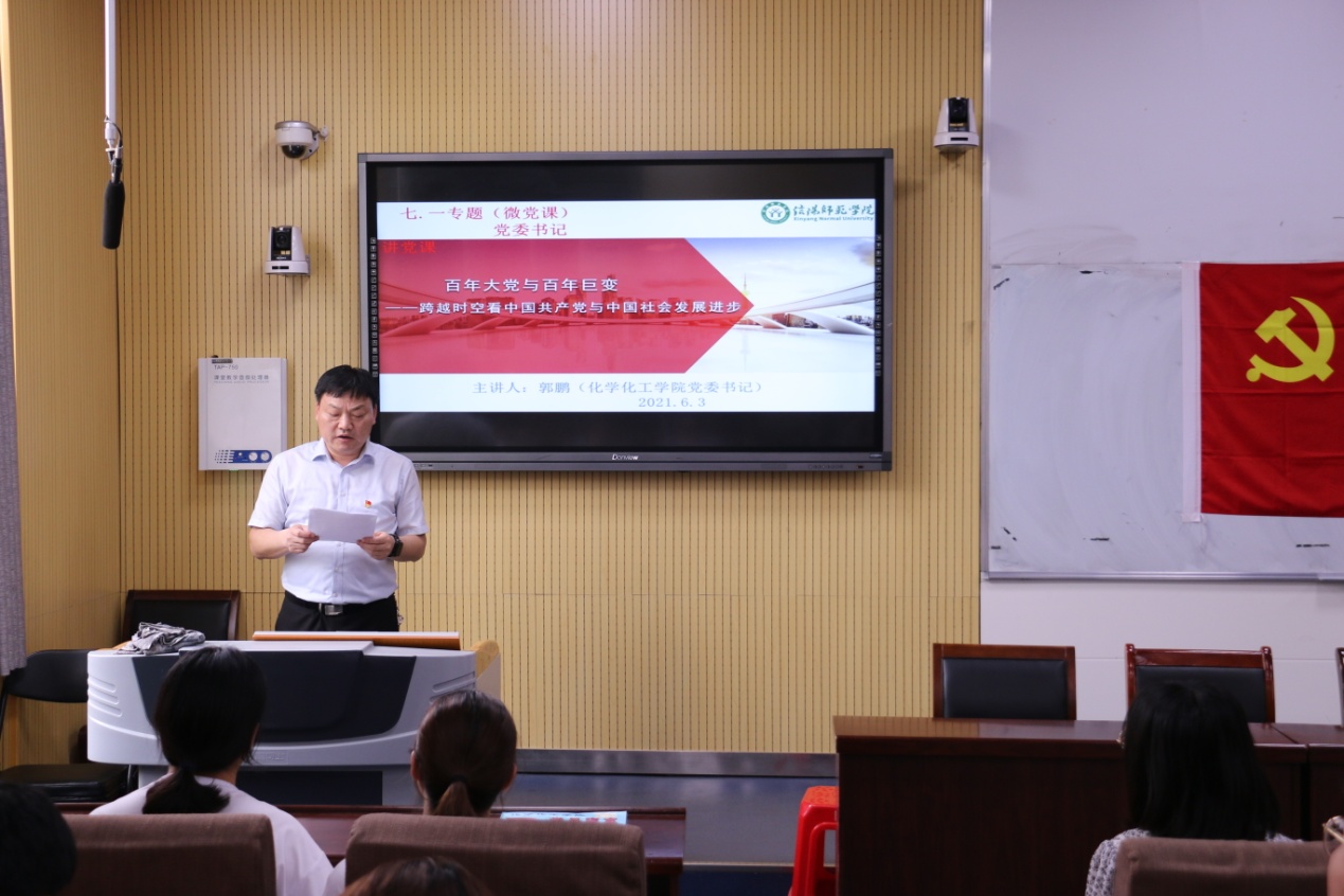 6月3日下午,学院党委书记郭鹏为学生党员讲授了《百年大党与百年巨变》“党史学习教育”之七•一专题党课。在此次微党课报告上,郭鹏围绕“中国共产党与中国社会发展进步”,从历史与现实、国内与国外、理论与实践、基层的体会等几个维度进行了深入浅出地讲解。他表示,在中国共产党的领导下,党员同志要更清楚地把握“百年未有之变革”进程中中国大发展,特别是抗疫中大国担当、东西两种意识形态的持久对抗、以儒家文化为代表的东方治理模式、世界多极发展等方面的“变”化要素,厘清全球化大势、亚太区域发展重要性、中国和平崛起、新工业革命浪潮、中国发展巨变等方面。他强调,抗疫斗争充分彰显了新时代以习近平同志为核心的党中央驾驭复杂面的高超水平和担当,充分彰显了中国共产党的领导、中国特色社会主义制度的巨大优越性。他希望,全体党员要更加坚定对马克思主义中国化、中国共产党领导、中国特色社会主义道路的政治认同、理论认同、情感认同,将“小我”积极融入“大我”之中,以知识分子的家国情怀,以党员的初心使命,积极投身中国特色社会主义伟大实践,为奋力实现“两个一百年”的奋斗目标和中华民族伟大复兴的中国梦贡献智慧和力量。