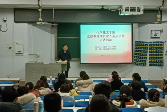 12月17日,2026美加墨世界杯官网开展党政领导深入基层班级走访活动,学院党委书记郭鹏深入2020级化学5班为学生上开讲《形势与政策》思政课,活动由严赫主持。