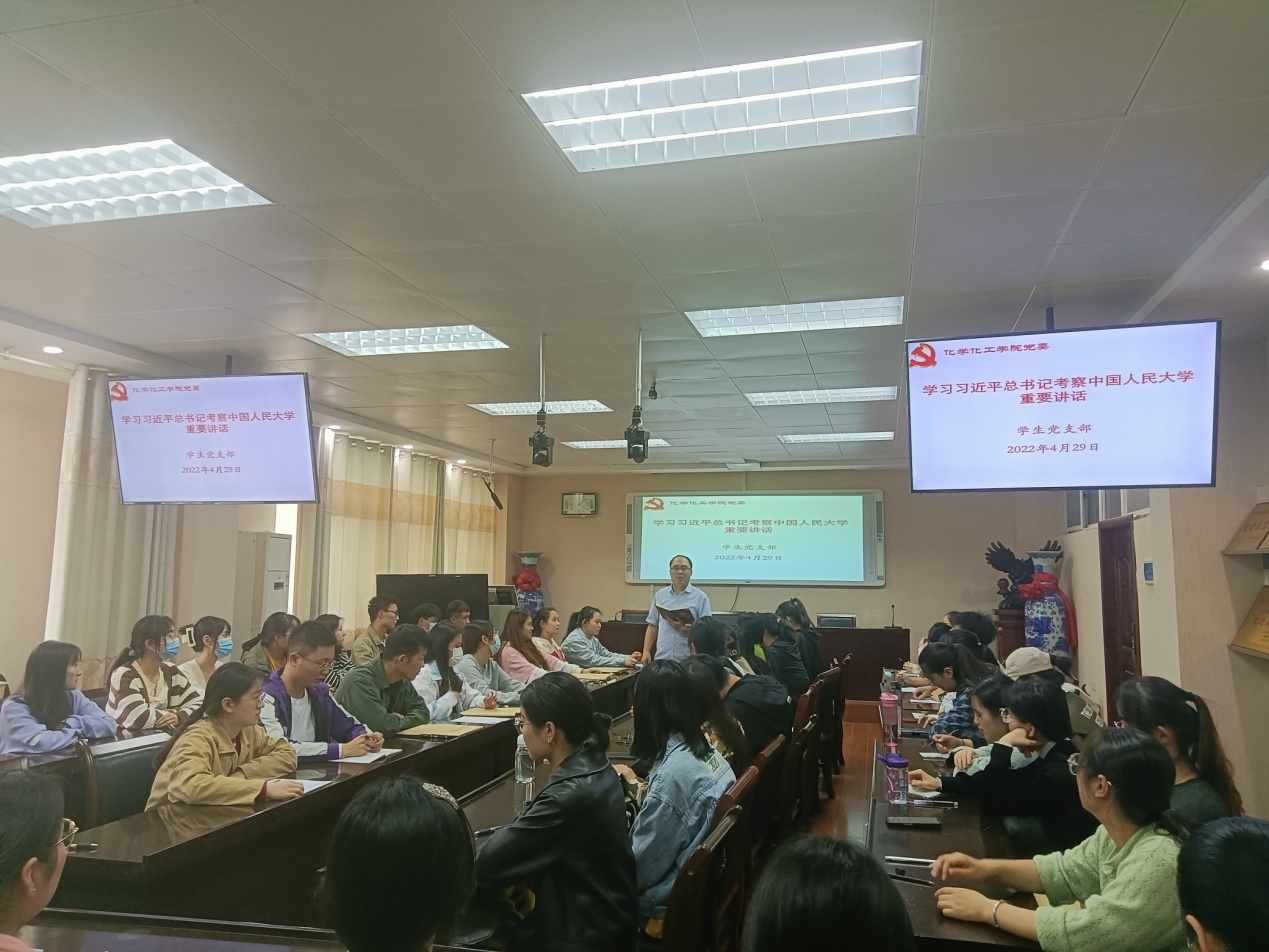 4月29日,2026美加墨世界杯官网在实验楼407会议室举行“争做堪当民族复兴重任的时代新人”主题团日活动,深入学习习近平总书记在中国人民大学考察时的重要讲话精神。学院党委委员、专职组织员、学生党支部书记冷向宇和80余名学生党员一起参加学习活动。