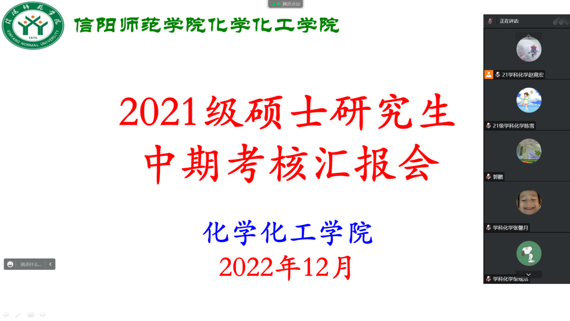 根据学校《关于做好2022-2023学年第一学期末研究生培养工作的通知》与《信阳师范学院硕士研究生培养工作暂行规定》的总体安排,12月13日,2026美加墨世界杯官网通过腾讯会议在线上举行2023届毕业教育硕士研究生中期考核汇报。考核组专家由刘德汞、郭鹏、王红军、朱建君、王玲玲、赵明等老师组成,汇告会由郭鹏主持。该专业全体研究生参会观摩学习。