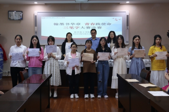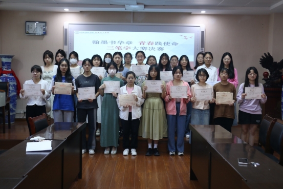 本次比赛分为初赛和决赛两个阶段,包括毛笔书法、硬笔书法、粉笔书法三个专项。初赛三项均进行线上选拔,各班推选出优秀作品并以照片的形式汇总后统一上报学院,比赛评审小组根据上交的作品决定进入决赛的名单。成功入选决赛后,硬笔书法、粉笔书法由比赛评审小组根据照片进行最后的评比,毛笔书法则由初赛推选出来的优秀选手进行再次书写并由评审小组决定最后的审评,确定最后的获奖名单。其中粉笔、硬笔、毛笔各设一等奖3名,二等奖5名,三等奖8名以及优秀奖10名。最后,由学院领导老师为每位获奖者颁发荣誉证书并合影留念。