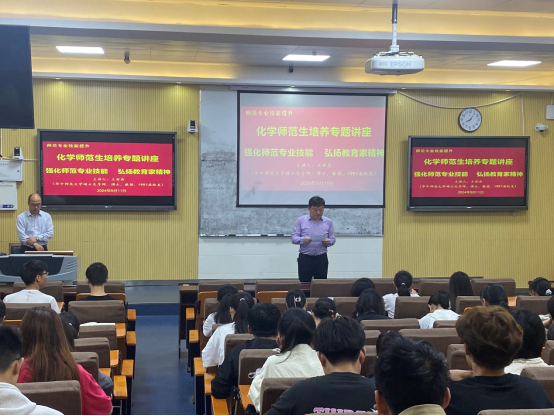 王世存结合自身从事化学师范生教育教学经历及对教育学理论知识的理解,围绕“什么是教育家精神”“如何成为卓越的教师”等问题展开报告内容,与师范生深入展开教师职业素养提升策略的交流。王世存认为,教育家精神是指具备优秀的教育家特质和品质,是致力于教育事业的个体所具备的精神风貌,并从十个教学法则关键点入手,向师范生深入讲解怎样成长为一名卓越教师的秘诀。